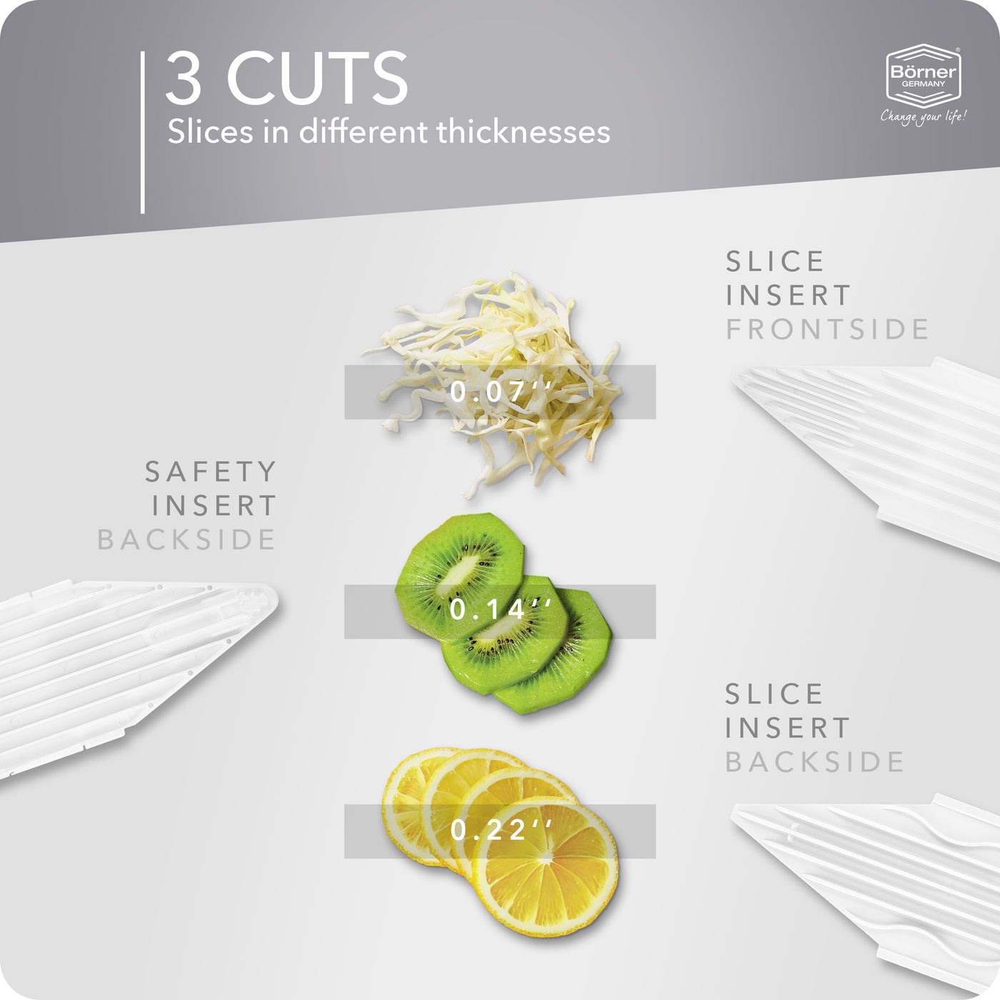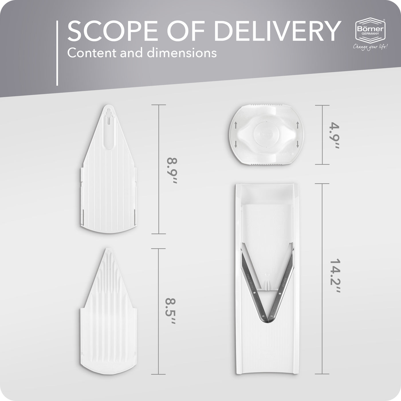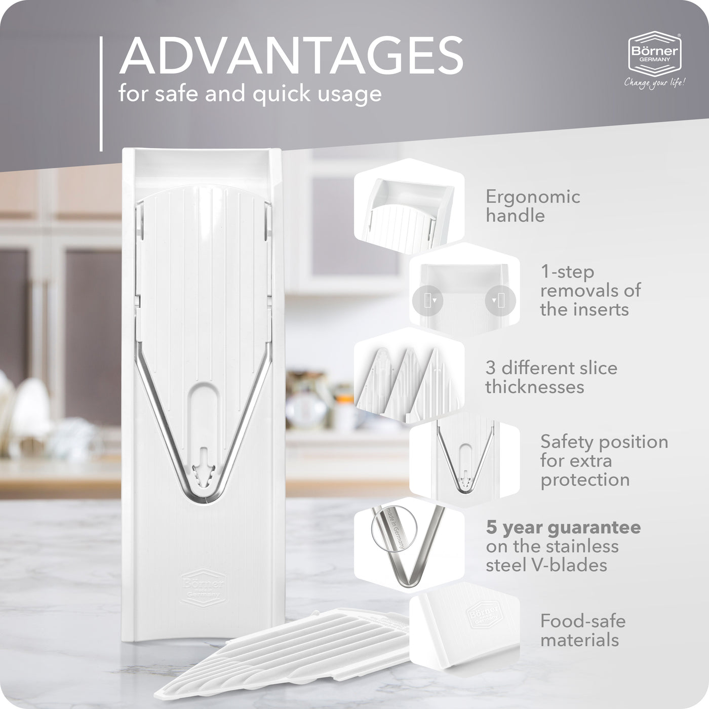 SAFE & EASY TO USE – The set includes a safety fruit holder. The fruit holder serves as a finger guard and protects your fingers from the sharp blades. Additionally, fruits & vegetables can be completely processed until the end. Your fingers are safe from any injuries with our Börner V1 ClassicLine Basic Vegetable Slicer Set.