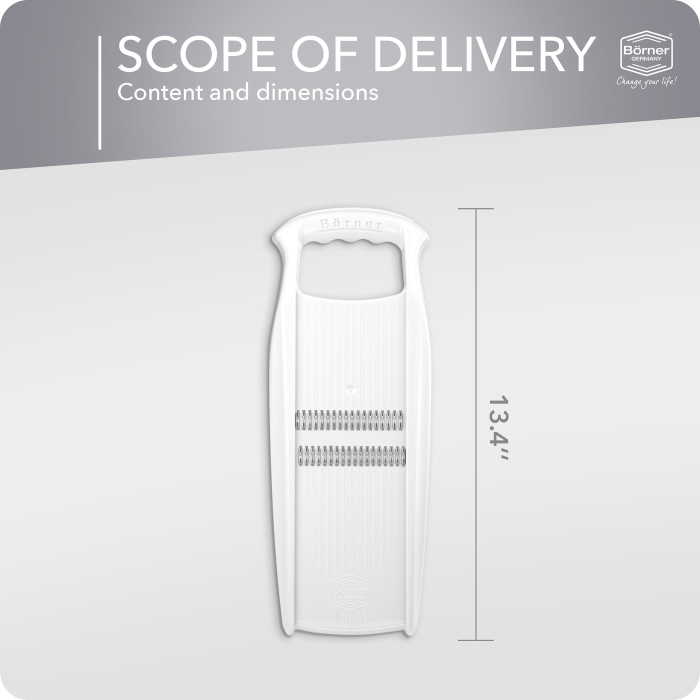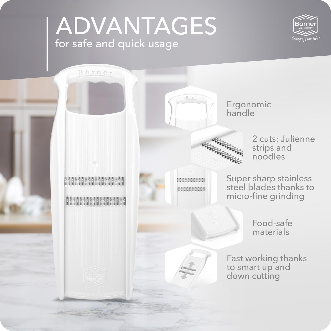 PRACTICAL JULIENNE SLICER – With the original Börner Roko grater, you can cut fruits & vegetables into fine julienne strips. The Julienne cutter is suitable for vegetables such as carrots, celery, or kohlrabi, but also for potatoes or cucumbers. Create delicious raw vegetable salads! You can also finely grate cheese and chocolate with this grater. Has 2 Cuts (0.06" JULIENNE Short & Long)