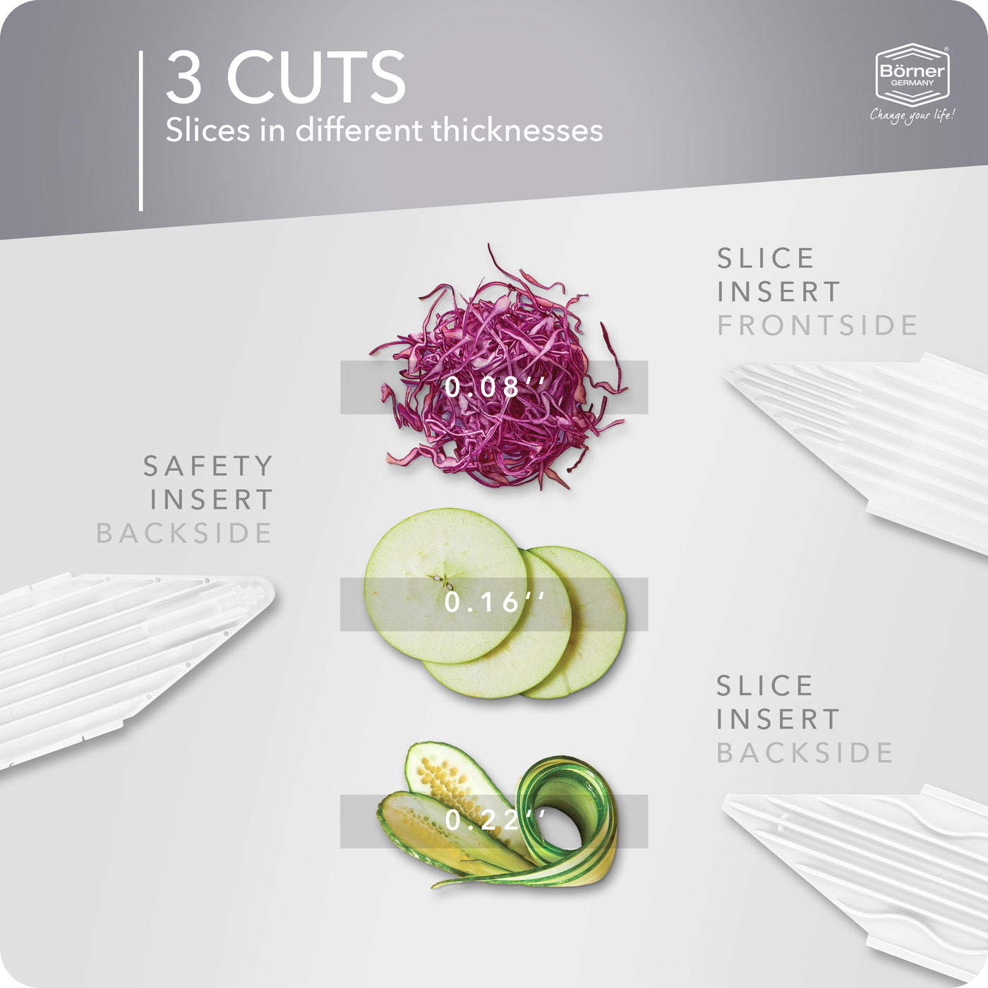 V3 TRENDLINE (STARTER SET) – With the Börner V3 TrendLine Vegetable Slicer Starter Set, you can quickly, precisely, and safely slice fruits & vegetables into thick, medium, or thin slices. Additionally, you can cut julienne strips or coarse and fine dices with the included inserts. For dices, pre-cut the produce crosswise, 3 Cuts ( SLICE: 0.08", 0.16" & 0.22"). Includes: Blade, Safety Insert, and Safety Food Holder.