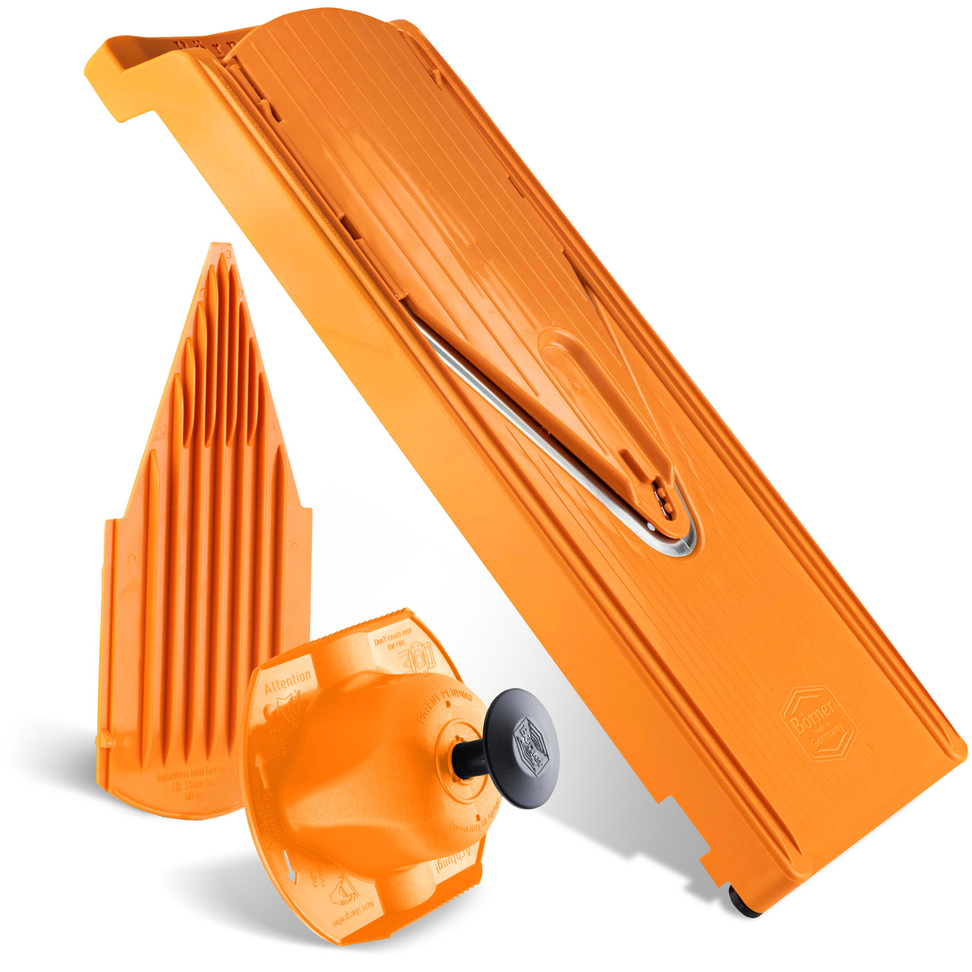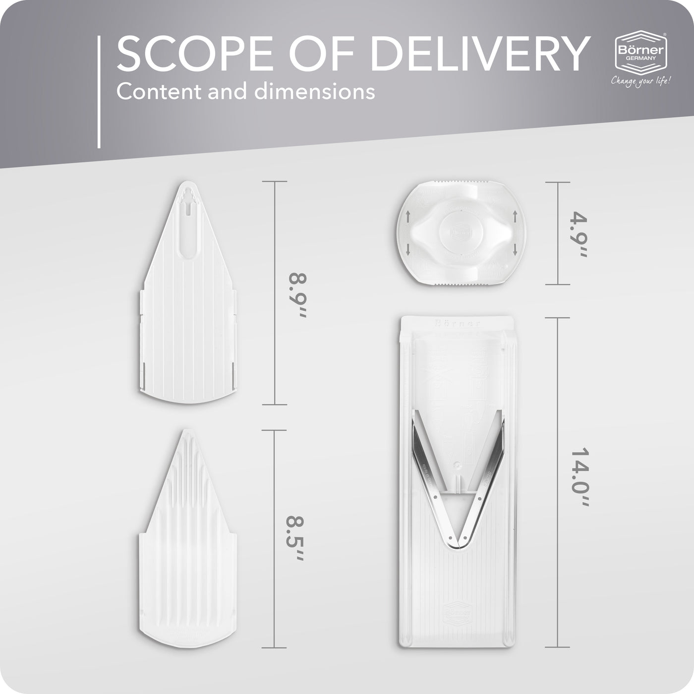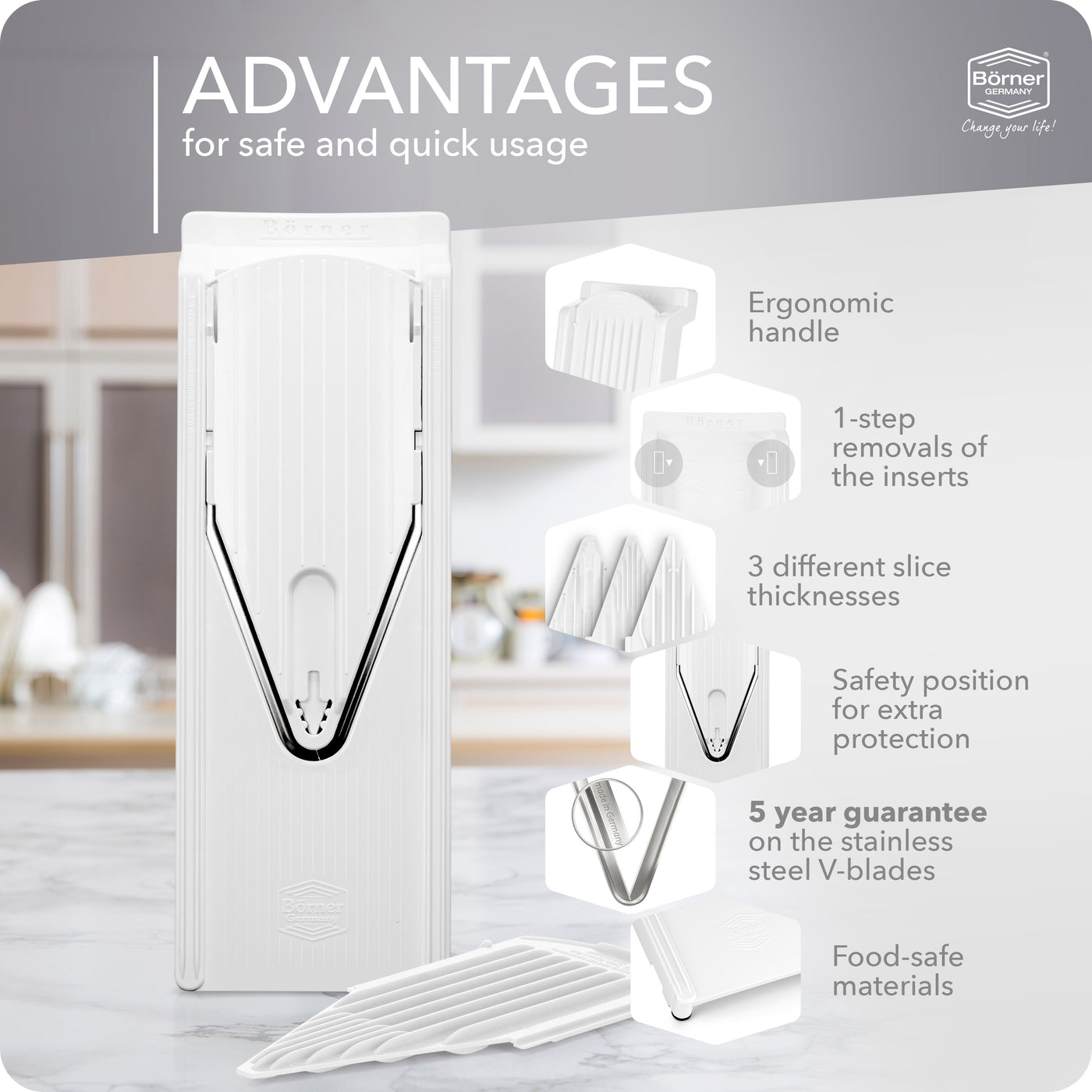 PATENTED BÖRNER V-BLADE – With the Börner V3 Mandoline and its ultra-sharp V-blade made of stainless steel, you can slice fruits & vegetables such as cucumbers, tomatoes, potatoes, bell peppers, radishes, and much more into even slices of different thicknesses. The vegetable slicer is also ideal for professional use in the catering industry or as a practical gift for home cooks.