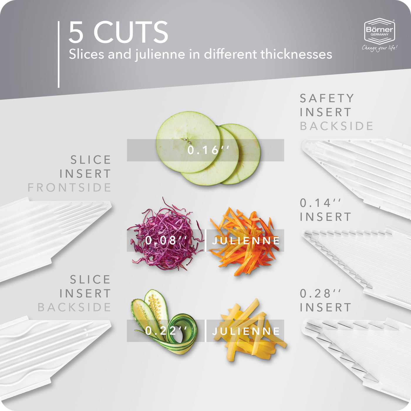 V3 TRENDLINE (PROFESSIONAL SET) – With the Börner V3 TrendLine Vegetable Slicer Starter Set, you can quickly, precisely, and safely slice fruits & vegetables into thick, medium, or thin slices. Additionally, you can cut julienne strips or coarse and fine dices with the included inserts. For dices, pre-cut the produce crosswise, 5 Cuts ( SLICE: 0.08", 0.16", 0.22" & JULIENNE: 0.14", 0.28"). Includes: Blades, Safety Insert, and Safety Food Holder, Docking Station, and Blade Box.
