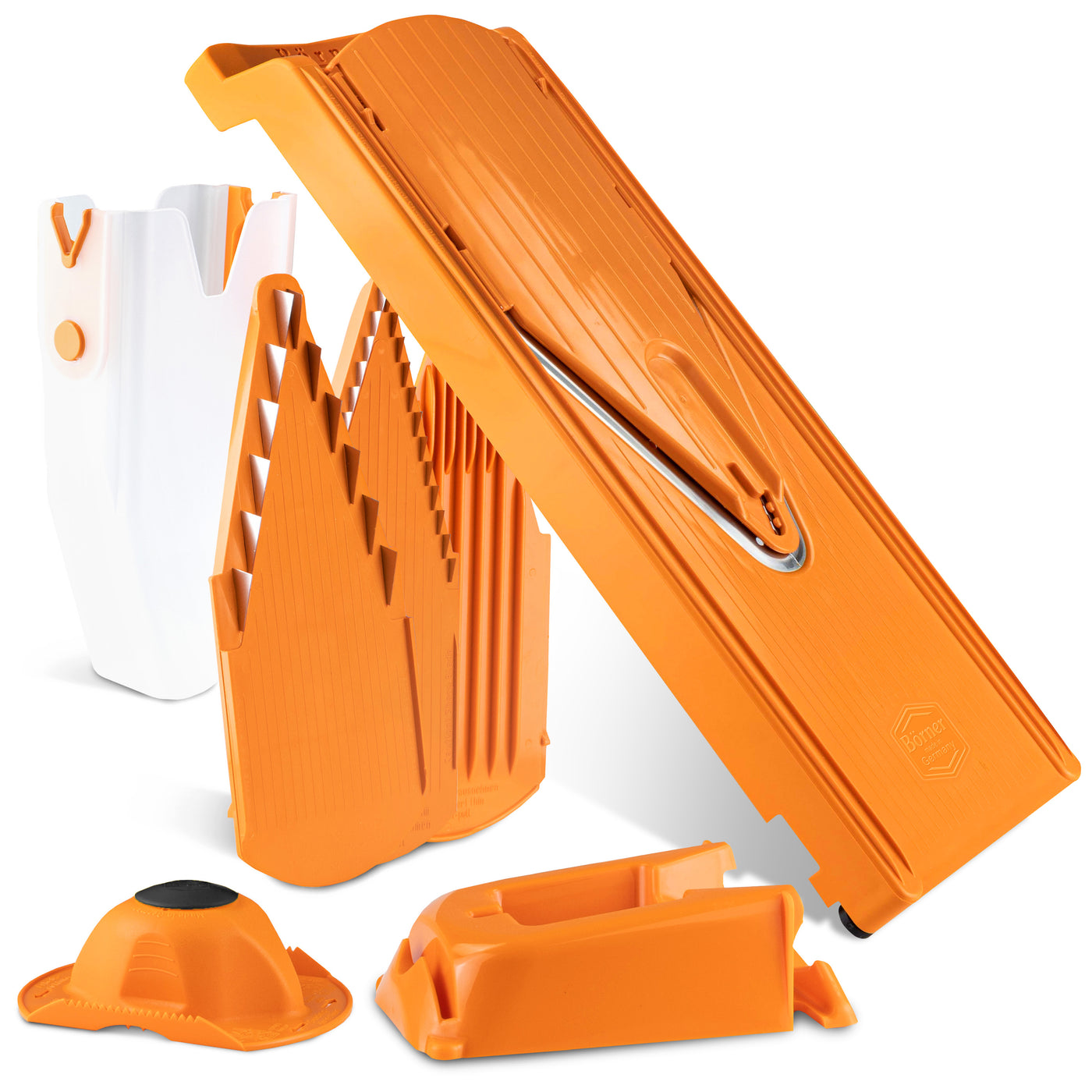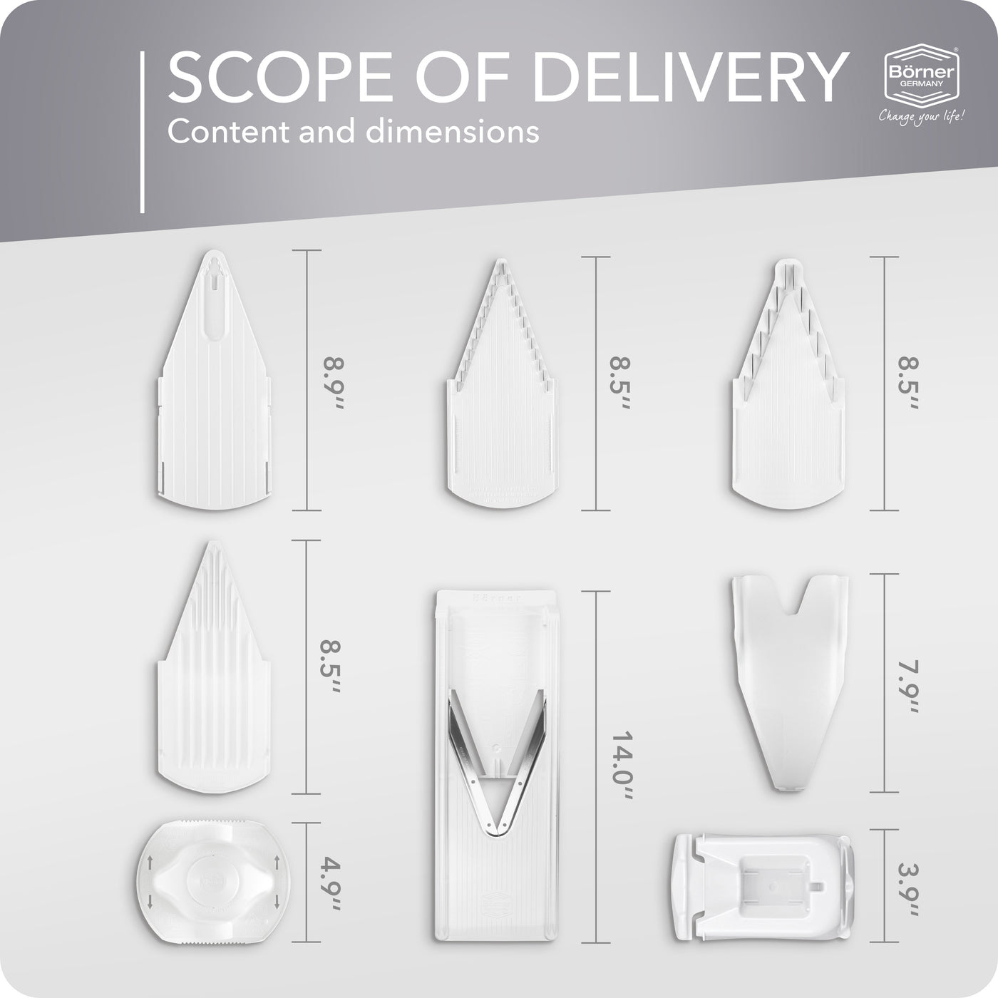 PATENTED BÖRNER V-BLADE – With the Börner V3 Mandoline and its ultra-sharp V-blade made of stainless steel, you can slice fruits & vegetables such as cucumbers, tomatoes, potatoes, bell peppers, radishes, and much more into even slices of different thicknesses. The vegetable slicer is also ideal for professional use in the catering industry or as a practical gift for home cooks.