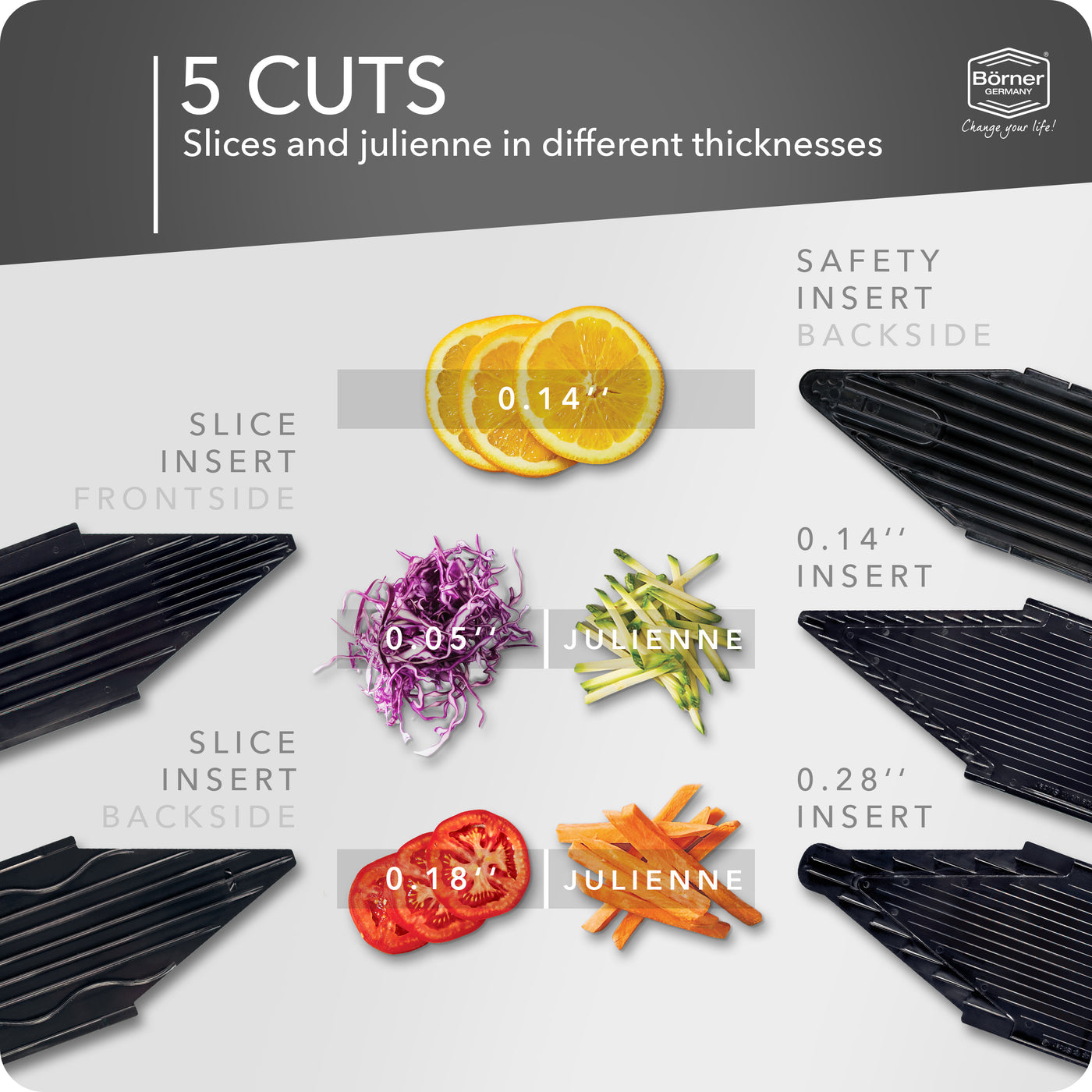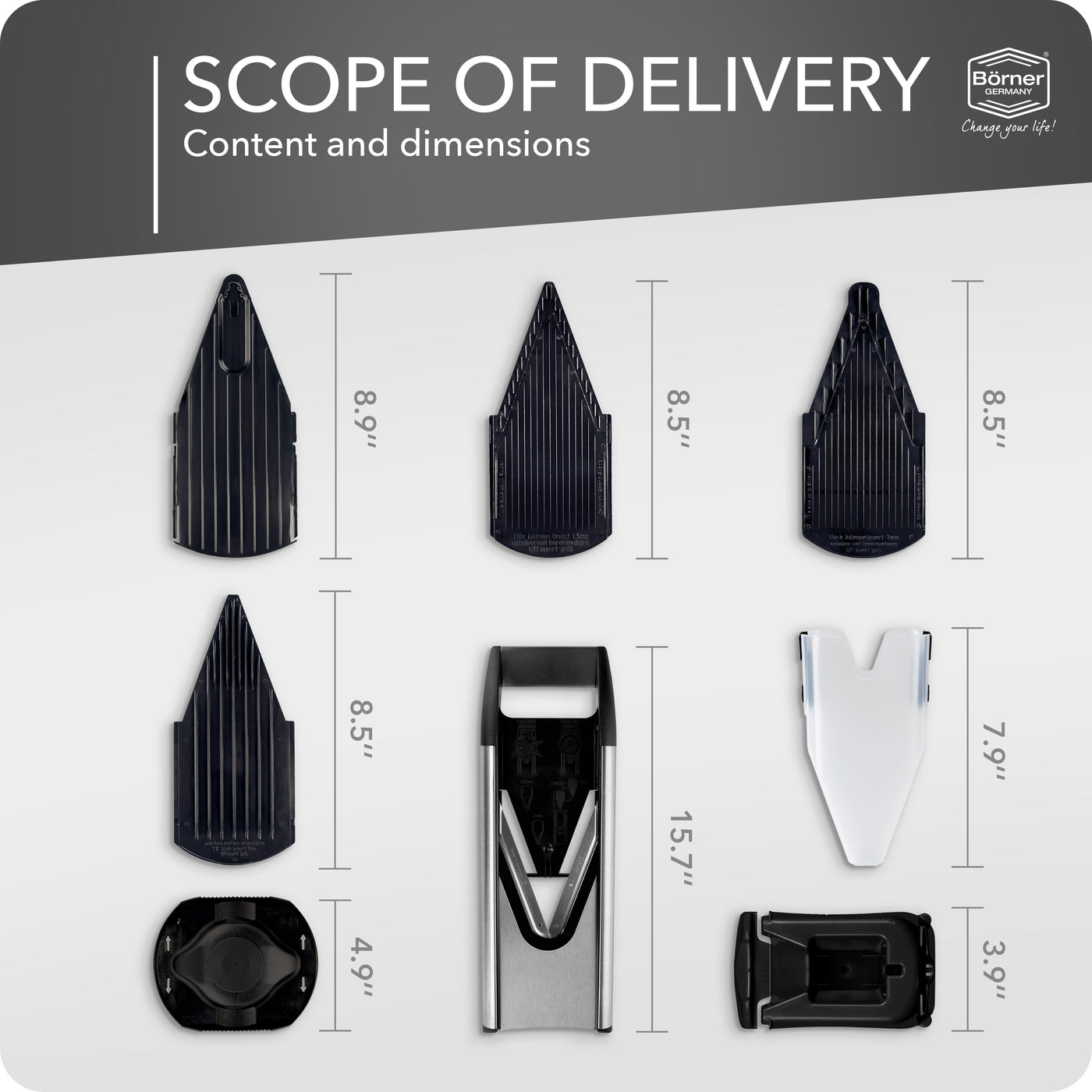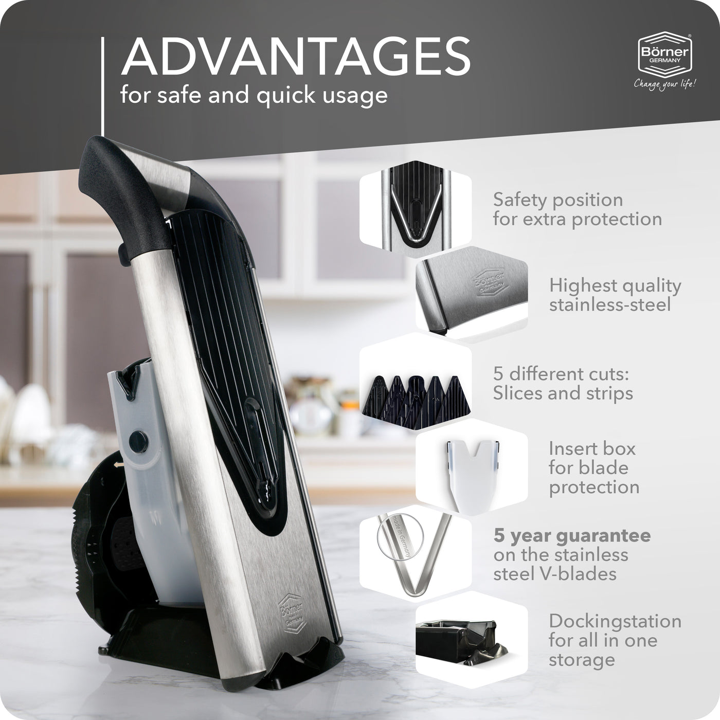 PROFESSIONAL STAINLESS STEEL MANDOLINE Our Börner Professional Vegetable Cutter (V-Slicer) features an ergonomic handle and non-slip rubber feet for safe use. The finely honed stainless steel V-blade can chop even hard to cut vegetables. This vegetable slicer is also ideal for professional use in the catering industry or as a perfect gift for home cooks.