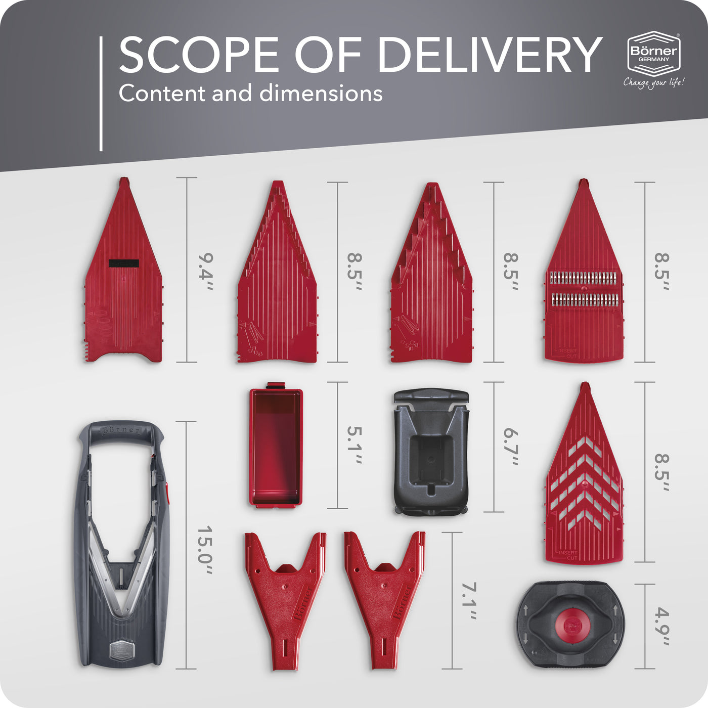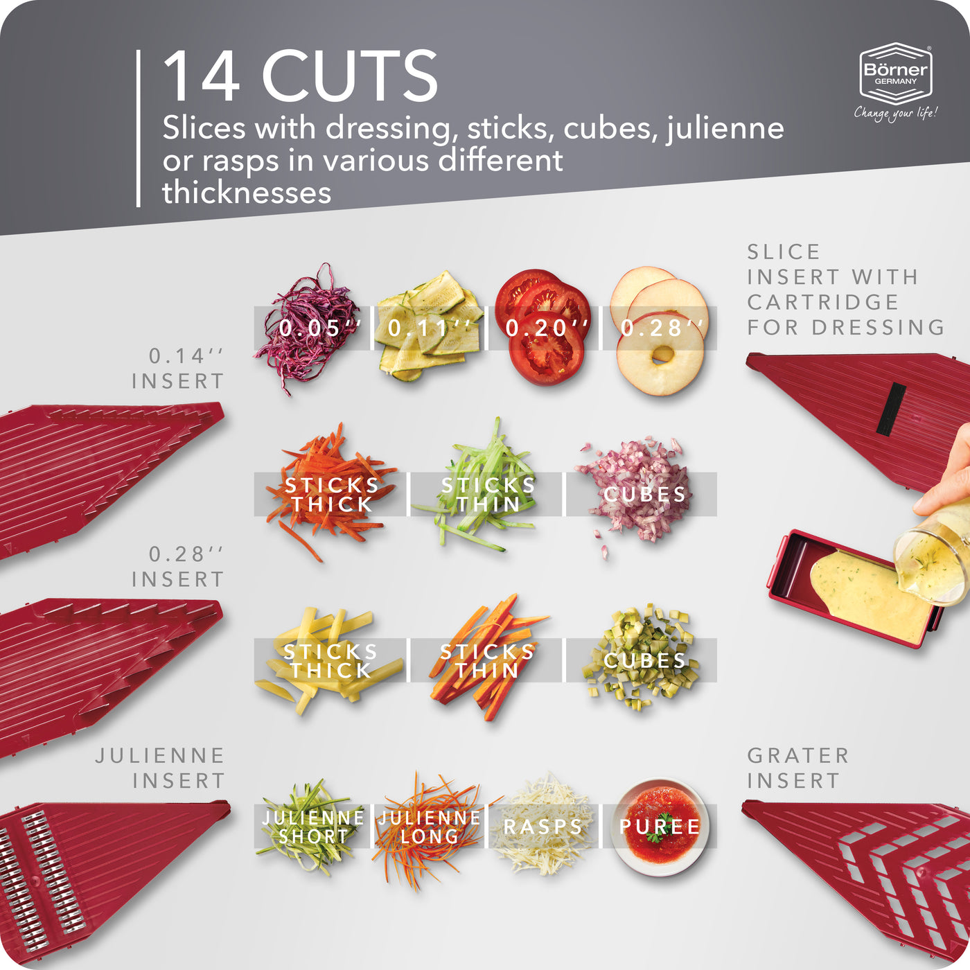 SET INCLUDES - Börner Vital Mandoline, Safety Insert, Dressing Cartridge, 10 Cuts (SLICE: 0.05", 0.11", 0.20", 0.28" & JULIENNE: 0.14"- Thick, Thin, & Cubes - 0.28" - Thick, Thin, & Cubes), Docking Station, and Blade Box.